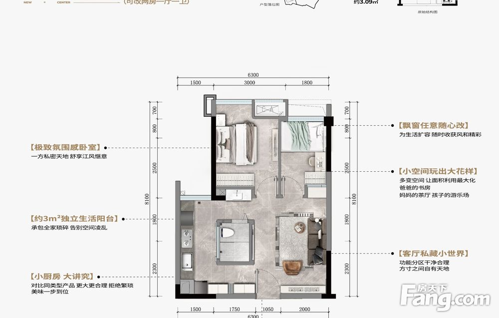 精装小户,套内使用率超90%,可租可住,灵活空间可改房型。