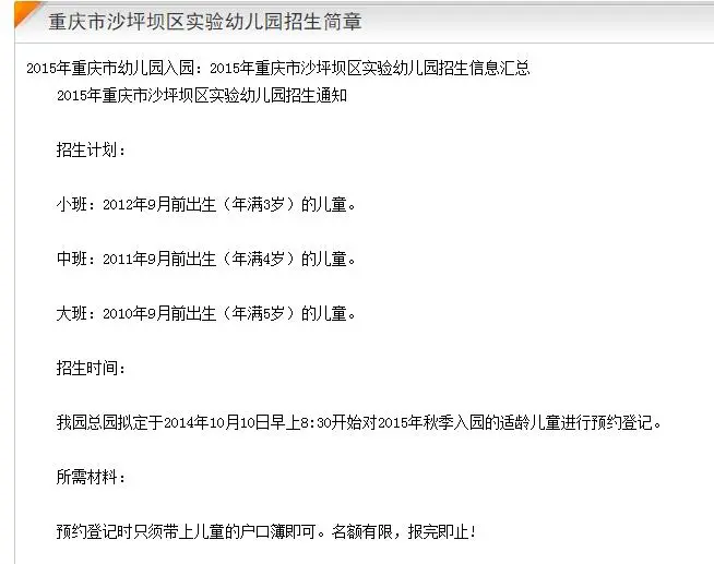 2017年重庆市沙坪坝区实验幼儿园招生信息汇总